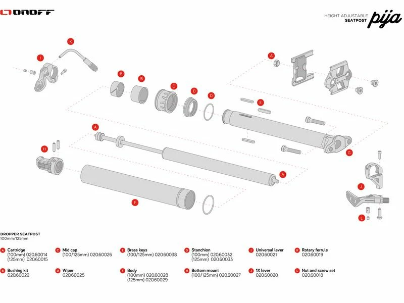 La cartouche hydraulique OnOff pour tige de selle télescopique Pija est disponible en plusieurs versions en fonction de votre débattement (100, 125, 150 ou 170 mm).